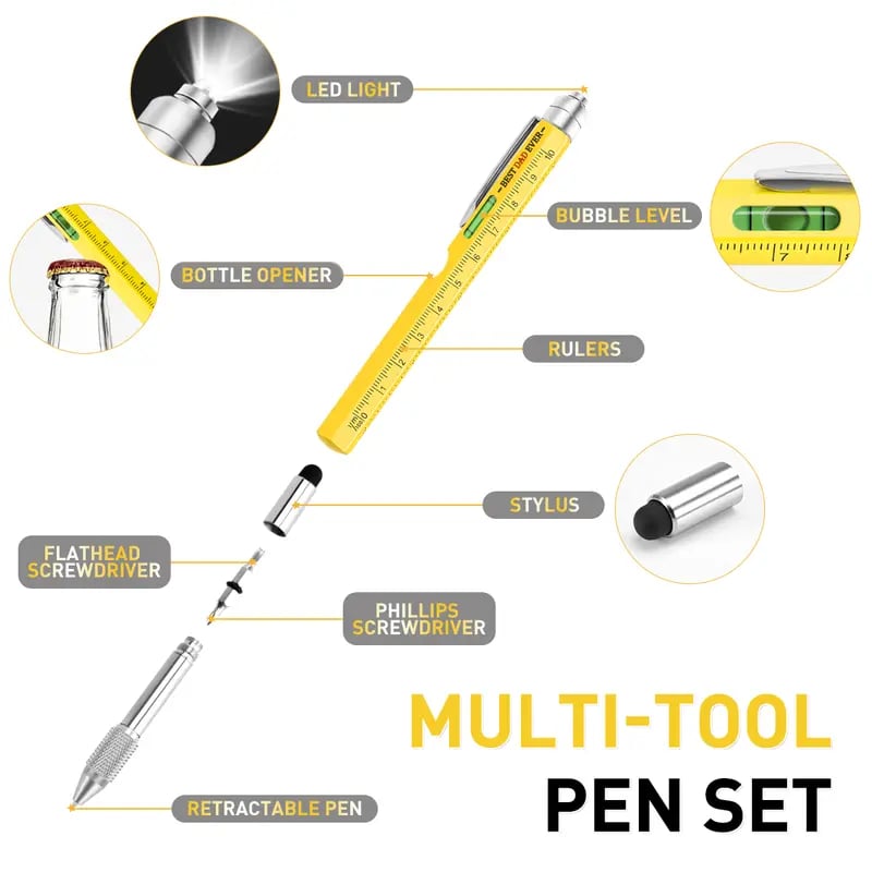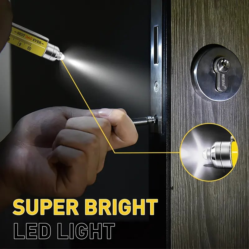 🔧 9-in-1 All-in-One Design: This compact multitool pen packs nine essential tools — LED light, ruler, stylus, bubble level, flathead & Phillips screwdrivers, twist ballpoint pen, and bottle opener (also works as a phone holder). Perfect for everyday fixes and creative work.