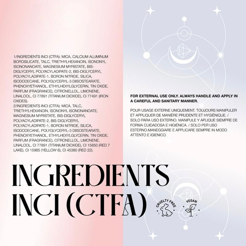 1/Ingredients Inci (Ctfa): Mica, Calcium Aluminum Borosilicate, Talc, Triethylhexanoin, Isononyl Isononanoate, Magnesium Myristate, Bis-Diglyceryl Polyacyladipate-2, Bis-Diglyceryl Polyacyladipate-1, Boron Nitride, Silica, Isododecane, Polyglyceryl-3 Diisostearate, Phenoxyethanol, Ethylhexylglycerin, Tin Oxide, Parfum (Fragrance), Citronellol, Limonene, Linalool, Ci 77891 (Titanium Dioxide), Ci 77491 (Iron Oxides). 2/Ingredients Inci (Ctfa): Mica, Talc, Triethylhexanoin, Isononyl Isononanoate, Magnesium Myristate, Bis-Diglyceryl Polyacyladipate-2, Bis-Diglyceryl Polyacyladipate-1, Boron Nitride, Silica, Isododecane, Polyglyceryl-3 Diisostearate, Phenoxyethanol, Ethylhexylglycerin, Tin Oxide, Parfum (Fragrance), Citronellol, Limonene, Linalool, Ci 77891 (Titanium Dioxide), Ci 15850 (Red 7 Lake), Ci 15985 (Yellow 6), Ci 45380 (Red 22).