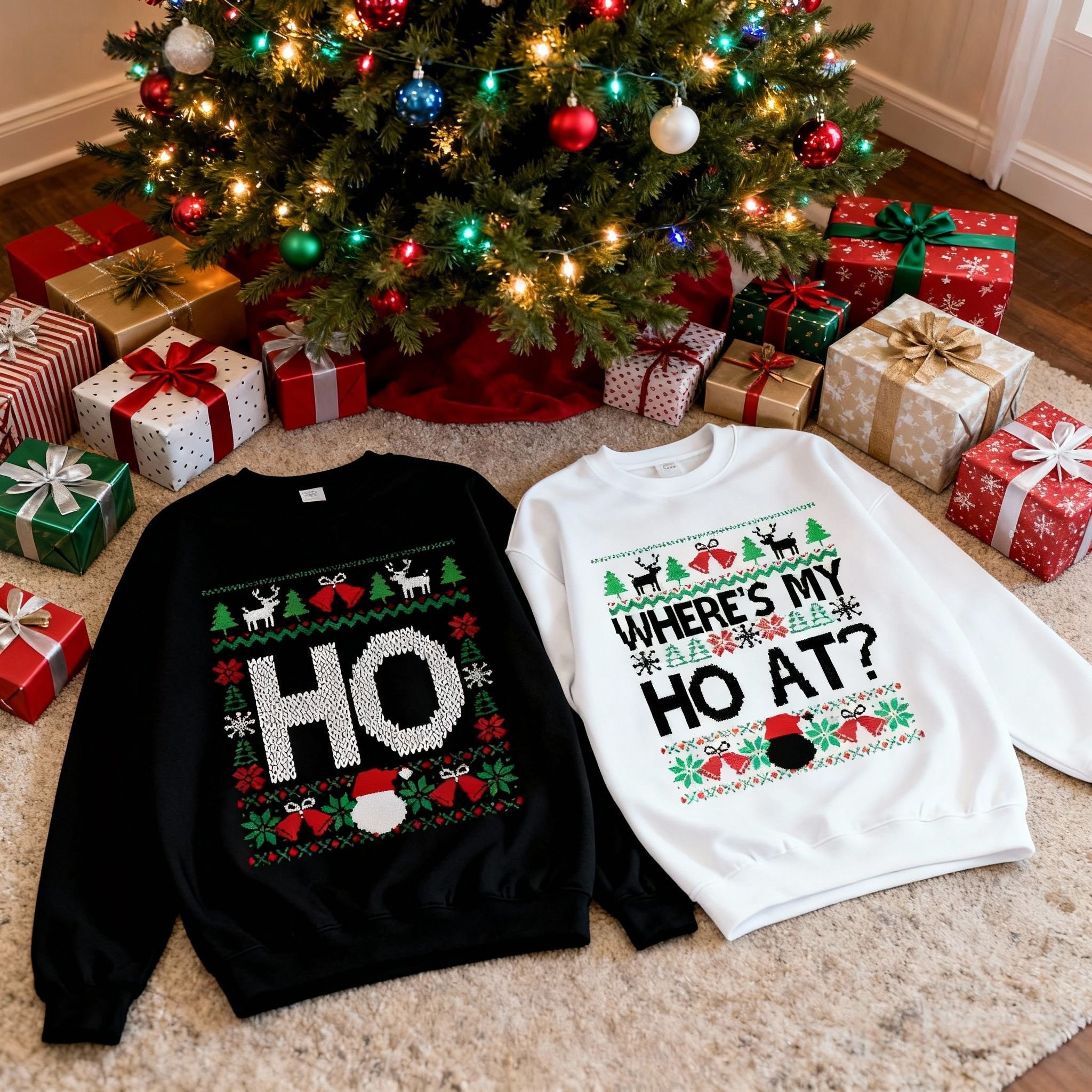 The high-contrast black base with bright knitted-style graphics makes the sweaters pop in every picture —Whether it's party lighting, a cozy living room, or a snowy outdoor backdrop.