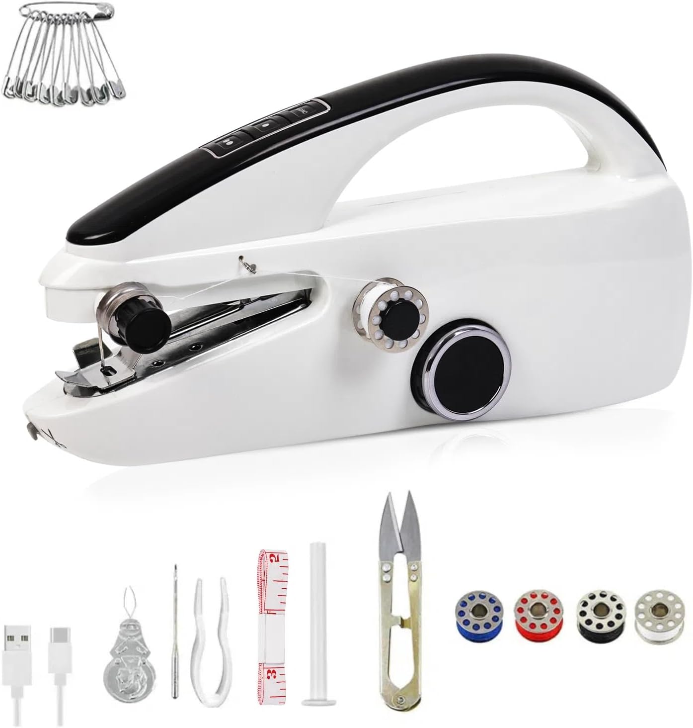 1 Piece Handheld Sewing Machine (with 4 Pieces Spools, 1 Piece Needle, 2 Pieces Threaders, 1 Set Pins, 1 Piece Plastic Clip, 1 Piece Tape Ruler, 1 Piece Pole, 1 Piece USB Cable).
