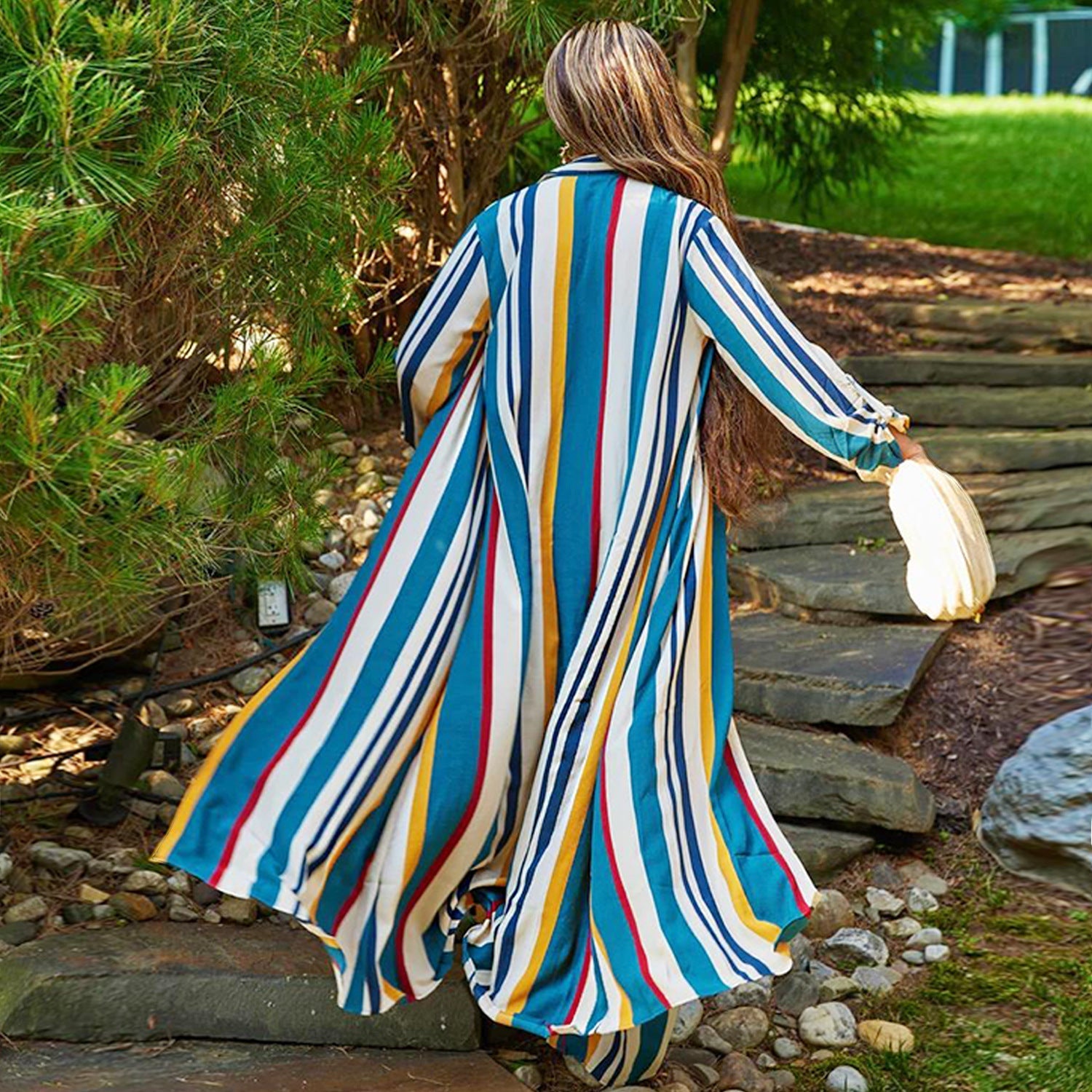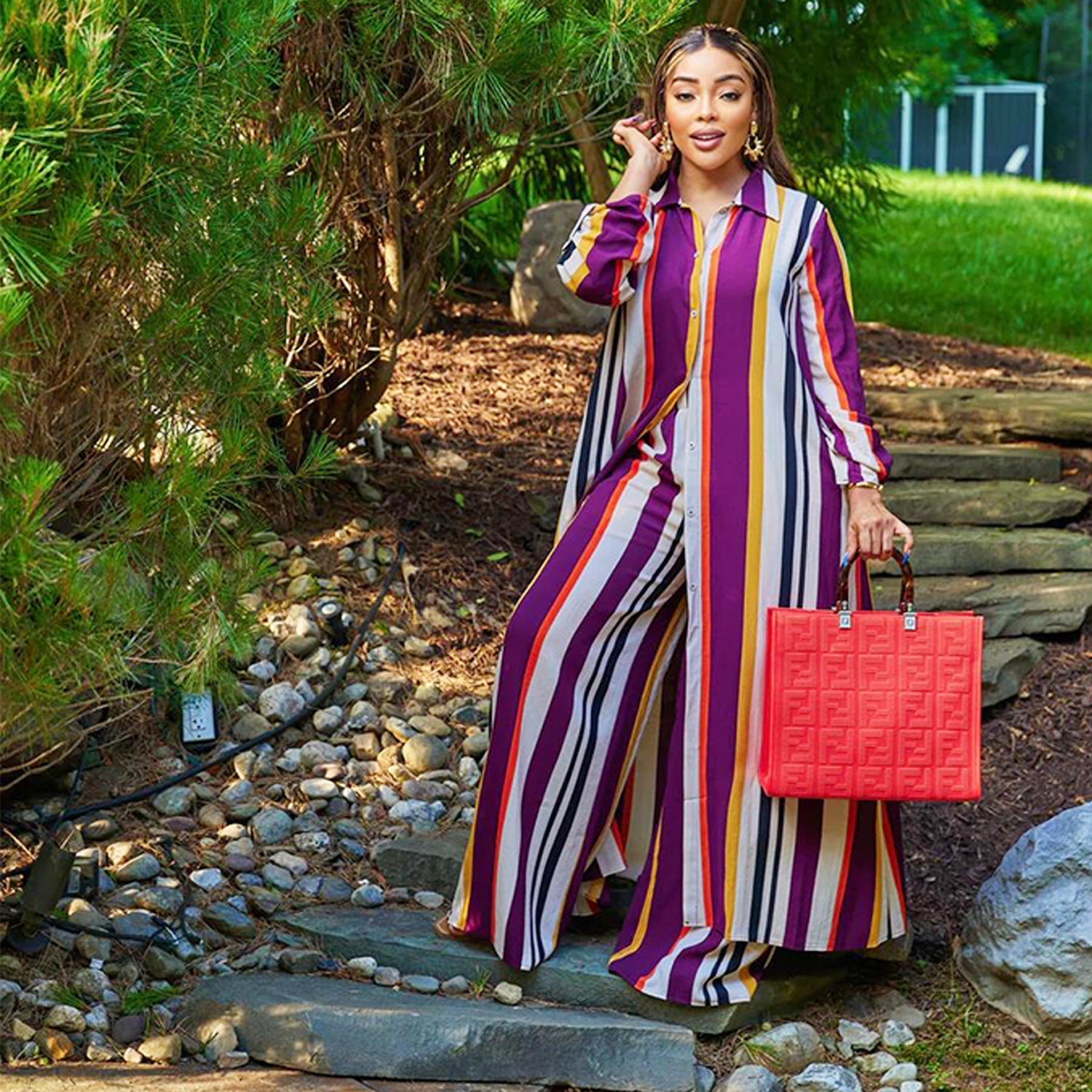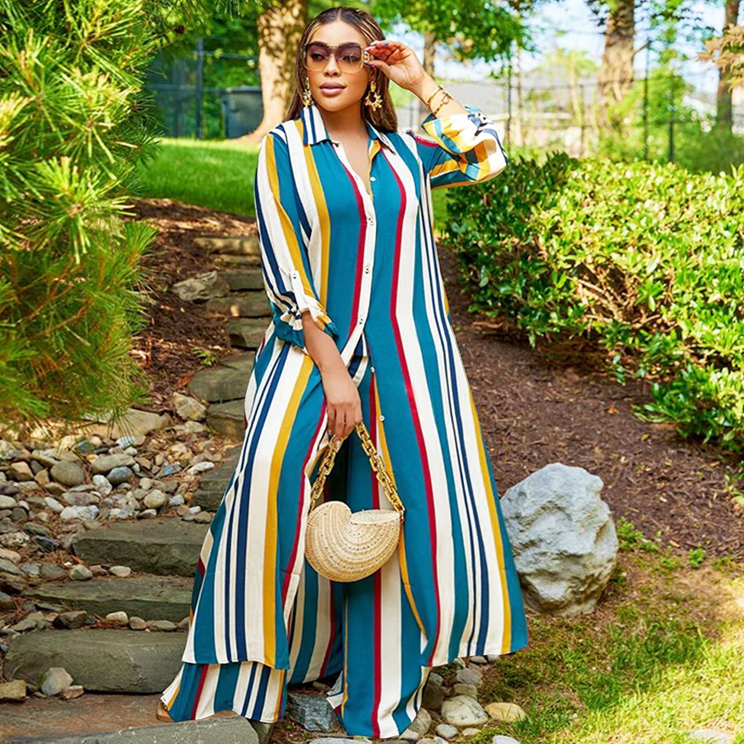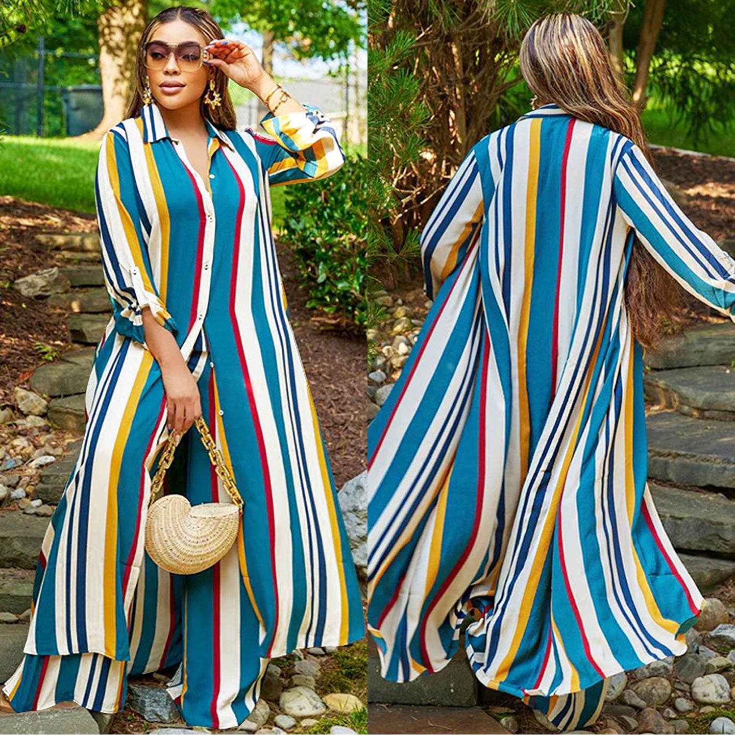 This women's striped long-sleeved jumper set, plus a long-sleeved pantsuit, is made from a high-quality polyester and spandex blend. It's stretchy, durable, and comfortable—a must-have outfit for all seasons. Wholesale two-piece pantsuits can solve your outfitting problems. Explore more two-piece pantsuits at The Little Connection's online wholesale women's clothing store.